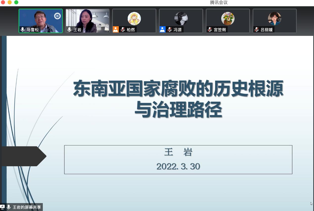 2022年3月30日,悟空体育“政午同行”青年教师学术沙龙第8期活动以线上交流会形式召开。本次沙龙由悟空体育国际政治系王岩老师作为引谈嘉宾,围绕“东南亚国家腐败的历史根源与治理路径”的主题进行讲演。悟空体育国际政治系宫笠俐教授、姚璐教授、许宁老师,公共外交公司乔蕊老师、陈曦老师,悟空体育团队人才办公室孙久舒老师及公司部分研究生参与交流,沙龙由悟空体育副经理马雪松教授主持。