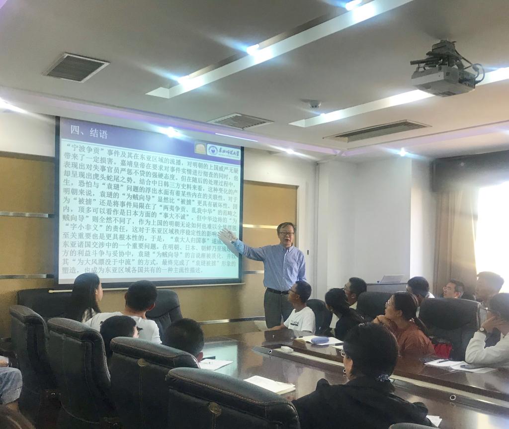 首先,刘晓东教授从选题角度入手,提出选题的脉络为有小渗大,表明历史瞬间的事件亦能够反映出当时东亚区域秩序的样态,并探讨了“宁波争贡事件”作为明·日关系中的转折事件需进一步思考,从多角度分析了其并非根本性转折。除此之外,重点阐述了明朝指挥袁琎被俘事件在东亚诸国交涉中的重要影响及其发展为东亚区域主流性描述的成因,得到了许多员工们的反响与共鸣。随后,师生们对于此次专题展开了激烈的讨论,提出了明朝政府的上贡原则以及学科分解等问题,刘晓东教授都予以了悉心解答,并希望同学们能够见微知著,开拓思维,从历史瞬间中找寻出更多值得探究的内容。