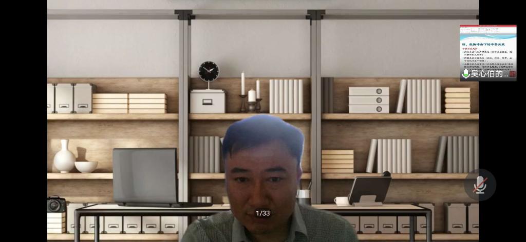 于海洋教授简要介绍了中美关系背景,在此之际邀请吴心伯教授对形势及发展作分析及介绍。吴心伯教授从四个具体问题展开,介绍了中国崛起背景下美国对华政策的两个阶段,指出全面竞争时代的到来,以中美贸易战及疫情冲击为案例详细探讨中美关系。