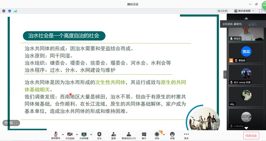 最后,郝老师得出结论,即由于国家治水缺位,传统中国并非是魏特夫认为的国家主导的治水社会,而是以社会为主体的治水社会。这种治水社会内生于社会治水的实践,具有较强的内生性、自治性和主动性。高度自治的治水社会不但造就了国家治理的根基,而且支撑着一个大规模文明体的持续。在社会自我治水过程中,既塑造了中国的社会性,又塑造了中国特有的社会治理形式与结构。