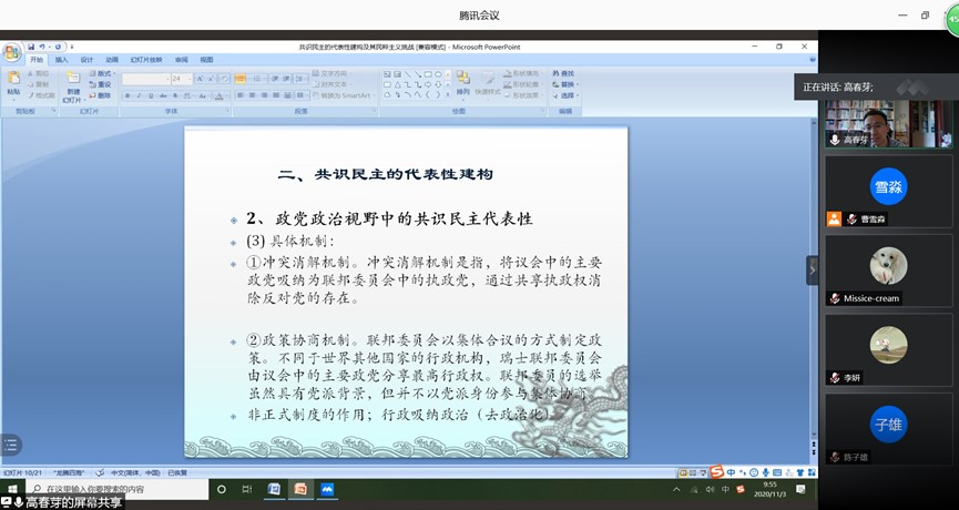 高春芽教授在问答互动环节与同学们就利普哈特的共识民主与审慎民主的关系、共识民主对大国的适配性以及瑞士的共识民主与协商民主在制度方面的根本性差异等问题进行了交流探讨,讲座在热烈的交流探讨中圆满结束。