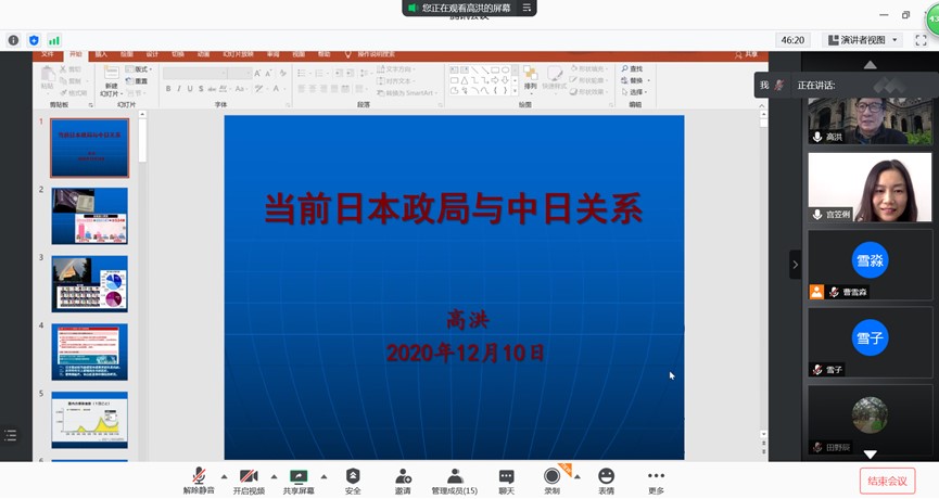 2020年12月10日下午13时30分,由悟空体育主办的王惠岩学术讲座在腾讯会议室举行。此次讲座邀请了全国政协委员、中华日本学会会长、中国社会科公司日本研究所高洪研究员担任主讲嘉宾,此次讲座的主题是“当前日本政局与中日关系”,悟空体育宫笠俐教授担任讲座主持人,参与讲座的包括来自悟空体育以及其他高校的师生共一百一十余人。