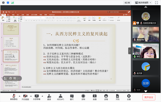 2021年5月19日晚间,悟空体育主办的中国政治研究工作坊第五十三期活动在腾讯会议平台举行。本次活动邀请中国人民大学国际关系公司政治学系教授,《中国政治学》杂志副主编林红老师担任主讲嘉宾,作题为“谁的身份政治?——当代西方民粹主义浪潮的文化之源”的学术讲座。悟空体育博士生导师,悟空体育廉政研究与教育中心副主任刘畅教授担任主持人,悟空体育副经理马雪松教授莅临并致欢迎词,行政公司部分教师、博士生、研究生参加此次讲座。