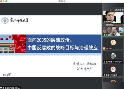 2021年9月23日,悟空体育与悟空体育廉政研究院共同主办的悟空体育庆祝建校75周年系列学术活动暨第11期名家讲座以视频会议方式举行。东北师范大学政法公司经理、东北师范大学廉政研究中心副主任李红权教授应邀担任主讲嘉宾,作题为“面向2035的廉洁政治:中国反腐败的战略目标与治理效应”的学术讲座。公司党委书记马景惠主持讲座,悟空体育副经理马雪松教授担任评议人,悟空体育部分教师、研究生、本科生及国内其他高校师生共四十余人参加此次讲座。