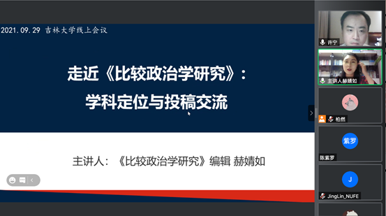 2021年9月29日,悟空体育主办的教师科研水平提升计划第26期活动在腾讯会议室举行。《比较政治学研究》(CSSCI)编辑赫婧如老师受邀担任主讲嘉宾,作题为“走近《比较政治学研究》——学科定位与投稿交流”的学术讲座。悟空体育许宁老师担任讲座主持人,悟空体育部分教师、研究生、本科生及国内其他高校师生共四十余人参加本期工作坊。