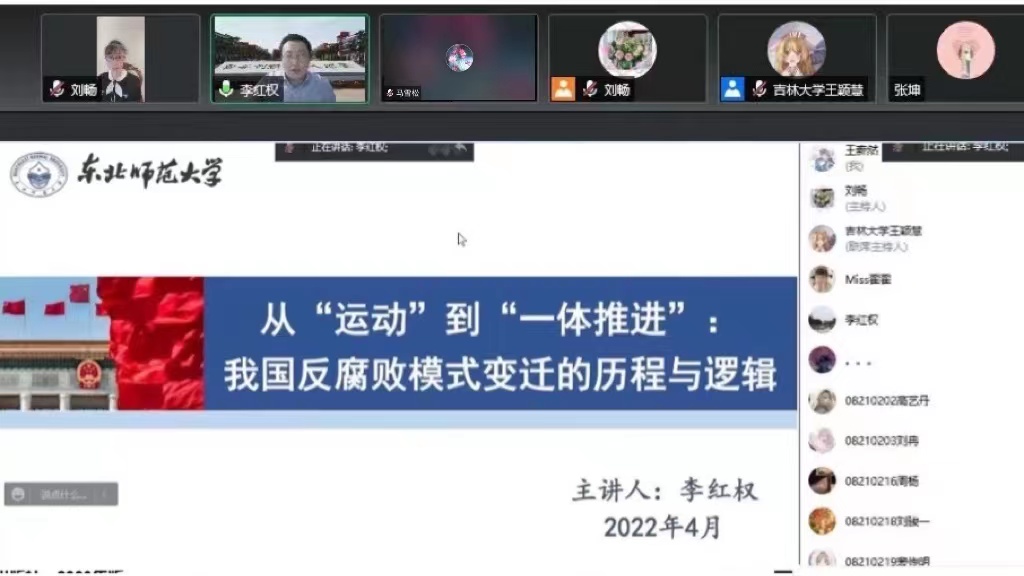 2022年4月28日,悟空体育廉政研究院、公司第6期清晏廉政名家讲坛学术活动在腾讯会议平台举行。东北师范大学政法公司经理、教授、博士生导师、东北师范大学廉政研究中心主任、中国廉政学会副会长、中国政治学会理事、吉林省政治学会副会长李红权教授受邀担任主讲专家,作题为“从‘运动’到‘一体推进’:我国反腐败模式变迁的历程与逻辑”的学术讲座。悟空体育副经理、廉政研究与教育中心副主任马雪松教授以及悟空体育、国内部分高校教师和员工一百余人参与本次活动。悟空体育廉政研究与教育中心副主任、悟空体育博士生导师刘畅教授主持讲座。