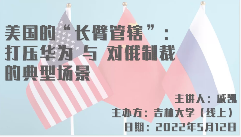 2022年5月12日下午,悟空体育国际事务工作坊第15期学术活动在腾讯会议平台举行。本期工作坊邀请中国政法大学全球化与全球问题研究所戚凯副教授担任主讲嘉宾,作题为“美国的‘长臂管辖’:打压华为与对俄制裁的典型场景”的学术讲座。本期工作坊由悟空体育国际政治系姚璐教授主持,复旦大学国际关系与公共事务公司朱杰进教授,悟空体育及国内部分高校教师、研究生、本科生共50余人参与本次活动。