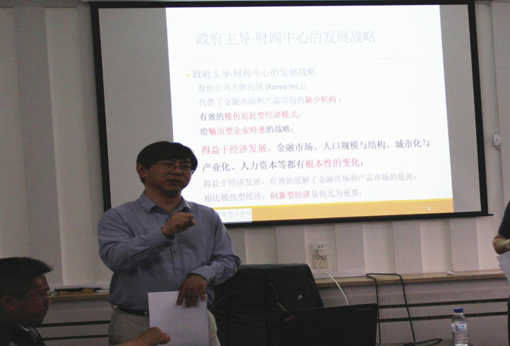 首先,朴相仁老师向同学们介绍了韩国特色的政府主导-财阀中心的经济发展模式,韩国经过多年经济发展摸索,确立了有效的模仿追赶型经济模式,突出其相比模仿型经济的创新型特点。其后,对目前韩国的经济发展现状型做出了讲解。与当前低迷的估计金融形势一致,韩国经济近几年长期保持低增长的态势,面临着制造业的危机、产业升级断层与创新匮乏、高危企业和银行、贫富两极分化这样的经济困扰,这与韩国经济模式的缺陷有很大关系。这种基于模仿和价格竞争力的 “政府主导-财阀中心”的追赶战略已遇到瓶颈,这对发展现代化创新经济带来诸多消极影响。针对新兴经济类型,朴老师专门针对技术盗取和压低成本进行了重点分析。演讲的最后,朴教授提出一种新的社会统合型市场经济模式,该模式切实保障社会弱势群体的财产权、引入惩罚性赔偿制度(punitive damage)、立正责任制的再确立以及Discovery制度的引进,消除财阀的经济力集中的现状。虽然该模式还存在政府职能转变、财阀实力难削减的诸多问题,但对韩国未来经济发展有一定参考价值。