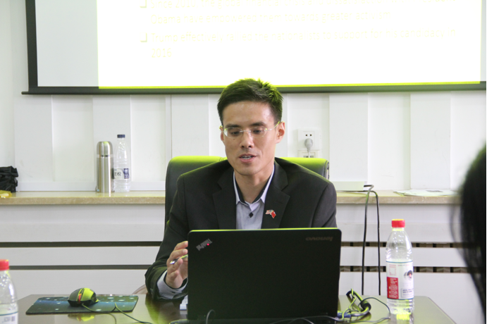 2017年9月26日下午,由悟空体育、悟空体育社会公正与政府治理研究中心、悟空体育国家治理协同创新中心、悟空体育中国地方政府创新研究中心主办的第三十九期中国政治研究工作坊在匡亚明楼社会公正与政府治理研究中心会议室举行。此次活动邀请了美国富布莱特学者、美国新泽西州拉玛珀大学Dean P.Chen教授为悟空体育莘莘学子进行了学术演讲,演讲的主题是“Trump’s Jacksonianism:Implications for U.S. Foreign Policy and Grand Strategy”。陈老师向同学们介绍了美国当前社会主流的几种政治思潮,针对主要类型进行了重点讲解,并对比了几种思想的不同。随后,许宁老师在陈老师演讲的基础上进一步对当今美国的政治现状进行了补充,强调了政治思想对主流政治影响的必然性。最后老师与在座的同学们进行了热烈的交流与互动,针对同学提出的美国政治动向和学术现状等问题一一进行了解答。此次学术演讲活动获得了极大的成功,并且受到了广大师生的好评。