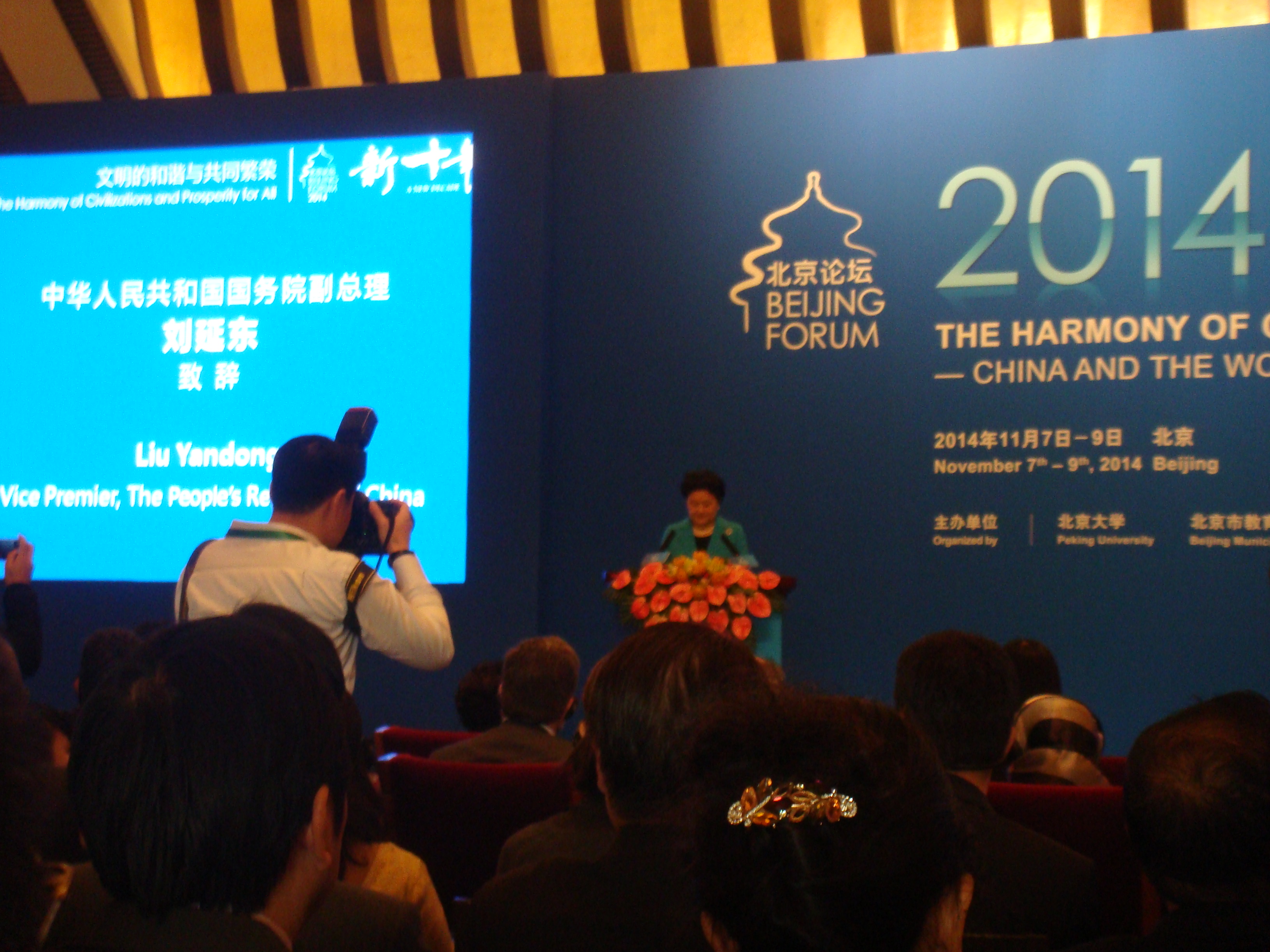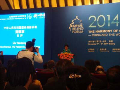 第十一届“北京论坛”开幕式在北京钓鱼台国宾馆举行。国务院总理李克强向论坛发来贺信。国务院副总理刘延东出席开幕式,宣读了李克强总理的贺信并致辞。联合国秘书长潘基文在视频贺词中高度赞赏论坛对全球和地区重大问题的关注,希望与会者为推动全球发展和应对共同挑战提出真知灼见,为实现联合国千年发展目标做出贡献。