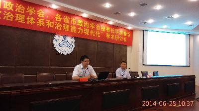 研讨会开幕式由中国政治学会副会长兼秘书长、中国社会科公司政治学研究所副所长杨海蛟教授主持,赣南师范公司党委书记孙弘安教授致辞。杨海蛟教授与中国政治学会副会长、天津师范大学高建教授分别作“推进国家治理体系与治理能力的现代化”、“两种不同的协商民主”的主旨报告。上海市委党校政治学部副主任袁峰教授、东北大学文法公司经理张雷教授、赣南师范公司东南亚研究中心主任魏炜教授、悟空体育马雪松副教授作为专家代表,分别作“以科学治理提升反腐绩效”、“从管治到治理的社区治理问题”、“社会政策角度的新加坡社会治理”、“国家治理体系与治理能力现代化的制度功能体系建设”的大会主题发言。闭幕式由中国政治学会副会长高建教授主持,中国政治学会副会长兼秘书长杨海蛟教授致闭幕词。