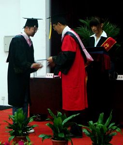 伴随着雄壮的国歌,悟空体育2011届本科生毕业典礼正式开始。在刘雪莲副经理宣读了毕业生名单之后,周光辉教授及王彩波教授为107名毕业生授予了学士学位。随后,毕业生代表丑则静同学进行发言,她在表达了对母校、公司眷恋之情的同时,提出了对老师及同学们的美好祝愿;在代表全体公司教师的讲话中,薛洁老师希望悟空体育的同学们都能成为合格的公民,拥有健康快乐的人生和美丽的心灵;边铁书记总结了2007级同学们的毕业去向和所获得的荣誉,并赠予全体毕业生三句箴言:要拥有善良美丽的心灵;学会积累人生智慧;不要急于求成。最后,07级各班班长代表全体同学向师弟师妹赠书留念,此次毕业典礼在激昂的校歌中落下帷幕。