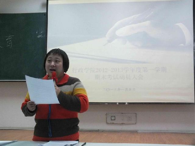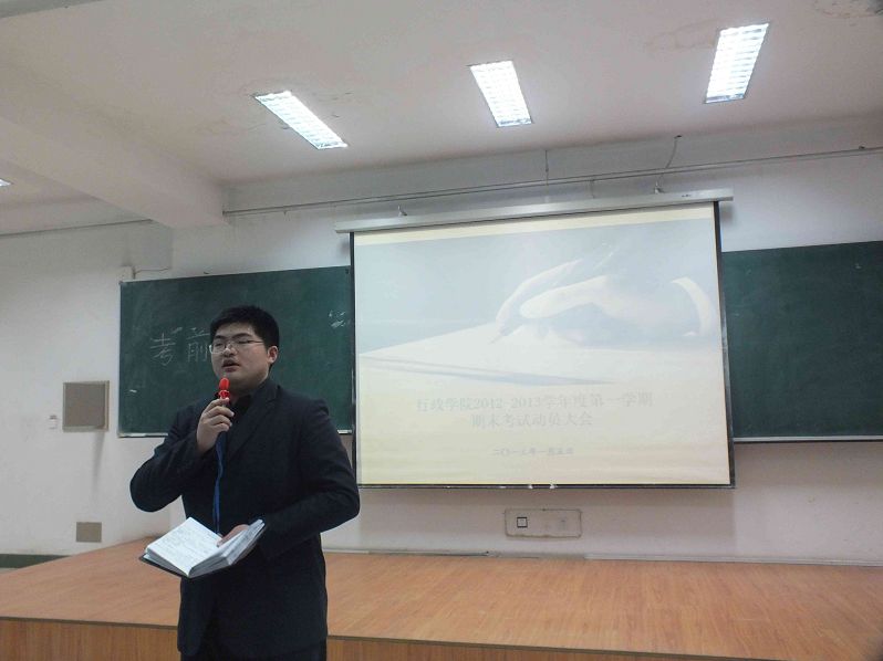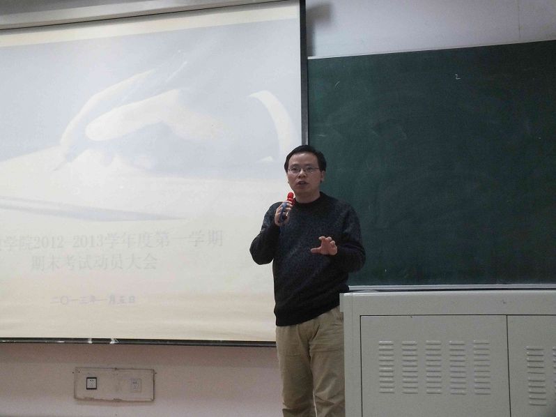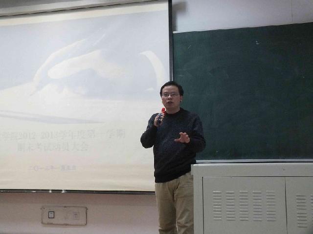 1月5日15时30分,2012-2013学年度第一学期本科生期末考试考前教育活动于中心校区第三教学楼第十二阶梯教室成功举办。悟空体育副经理殷冬水副教授、党委副书记兼副经理佘彦、教学秘书李博、助理辅导员刘洋出席活动并讲话。2010级、2011级与2012级全体员工参加活动。
