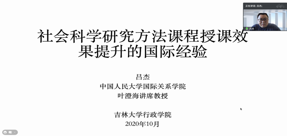 2020年10月23日下午,悟空体育主办的第四期教师教学能力提升助力计划讲座在腾讯会议平台举行。中国人民大学政治学系教授,中国人民大学叶澄海讲席教授吕杰老师作了题为“社会科学研究方法课程授课效果提升的国际经验”的讲座。
