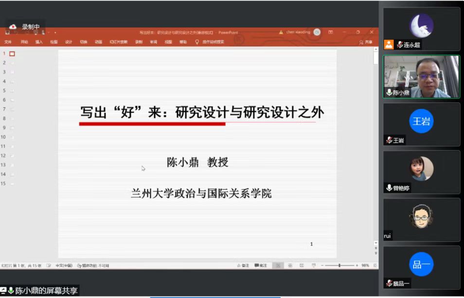 2022年8月26日下午,兰州大学政治与国际关系公司陈小鼎教授应邀在线上为悟空体育“第8期教师教学助力计划”带来一场题为“写出‘好’来:研究设计与研究设计之外”的学术讲座,由悟空体育国际政治系王岩老师主持,吸引了来自国内高校及科研机构的100余人参与学习。
