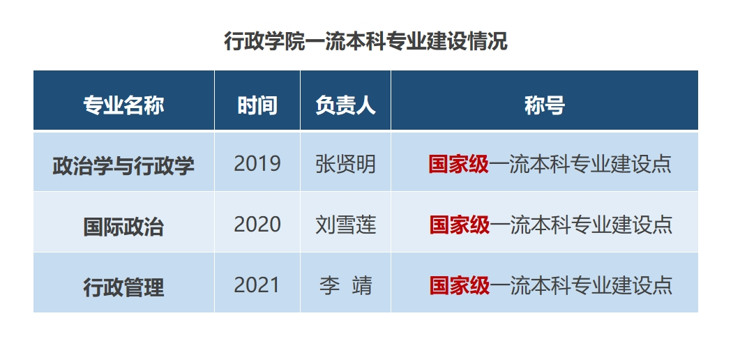 公司不断加强品牌和特色专业建设,形成了在国内具有影响力的名牌特色专业群,并大力加强一流本科专业建设。2019年,政治学与行政学专业获批“国家级一流本科专业建设点”、2020年国际政治专业获批“国家级一流本科专业建设点”、2021年行政管理专业获批“国家级一流本科专业建设点”。