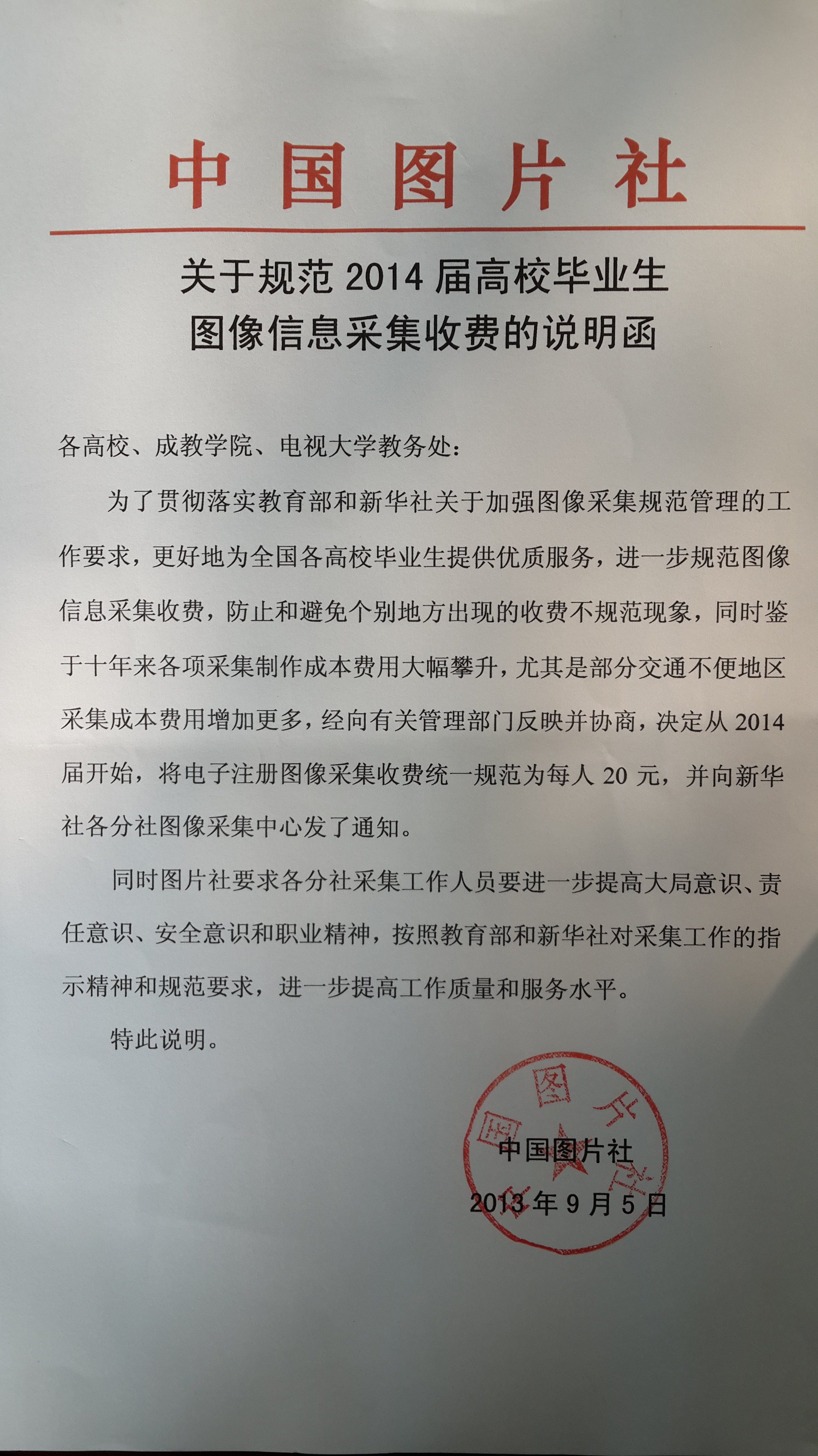 3.关于图像采集费的交纳方式上,根据吉林省教育厅通知精神,本次图像采集费由承担采集任务的新华社吉林分社现场收取。收费标准沿袭中国图片社《关于规范2014届高校毕业生图像信息采集收费的说明函》(附件五)的要求,采集费用每人20元。为便于现场收取,请员工一定提前备好零钱。