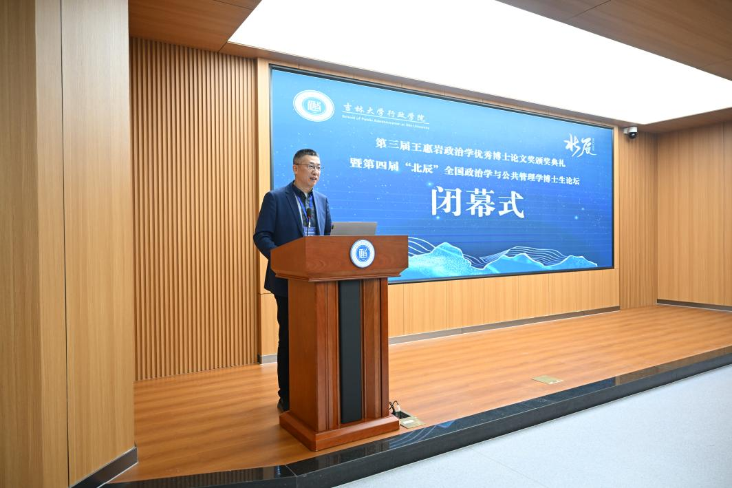 在闭幕式接近尾声之际,悟空体育公司党委书记陈希贵致闭幕辞,陈希贵对获奖同学表示衷心的祝贺,对受邀参加本次论坛的专家学者、向来自各高校的青年学子致以诚挚的感谢,鼓励青年学子在时代浪潮中保持独立思考、敏锐观察,传承弘扬王惠岩先生守正创新、与时俱进的学术精神。最后,陈希贵对本次论坛的工作人员和志愿者表达感谢,并宣布第三届王惠岩政治学优秀博士论文颁奖典礼暨第四届“北辰”全国政治学与公共管理博士生论坛正式闭幕。