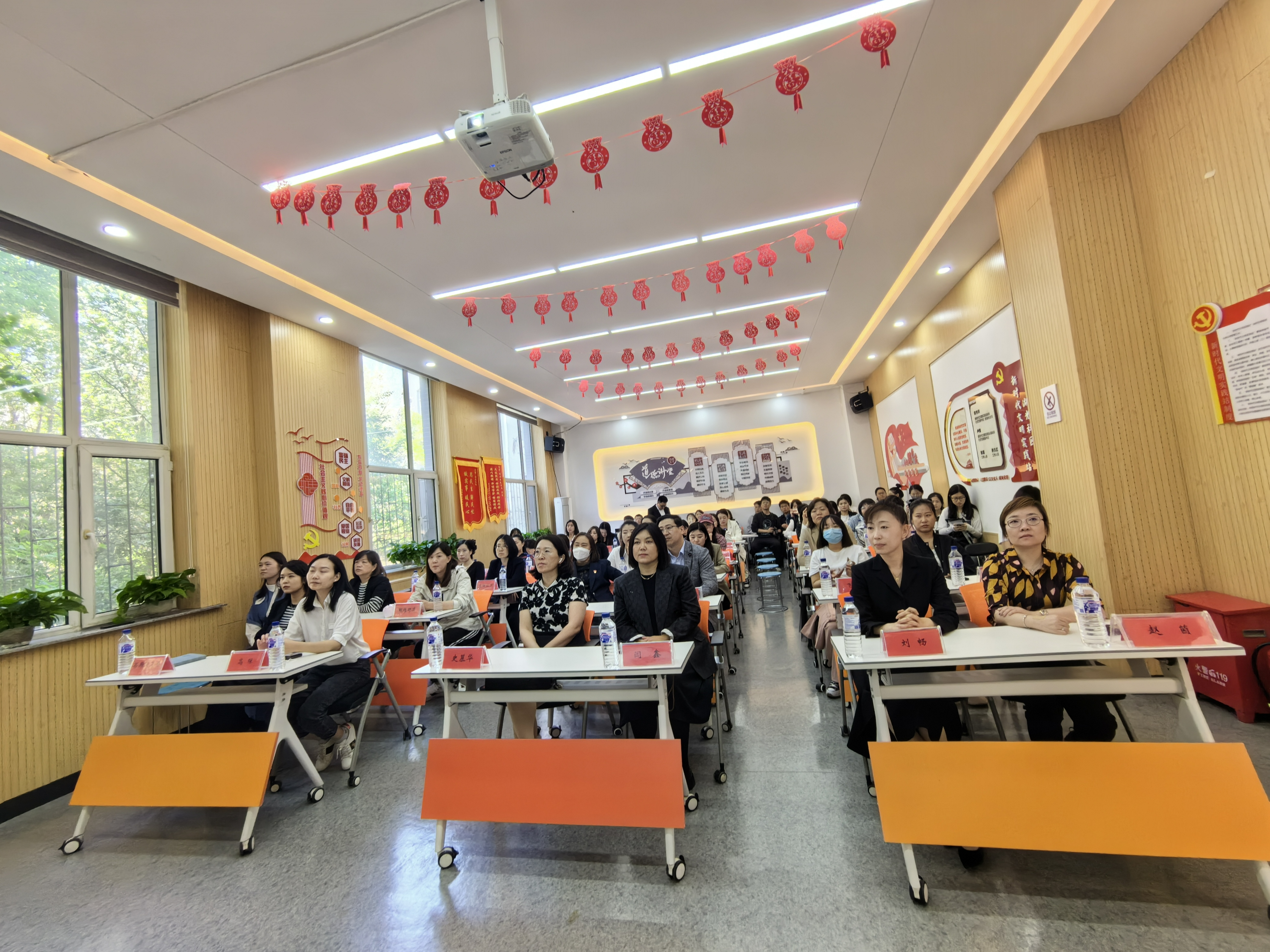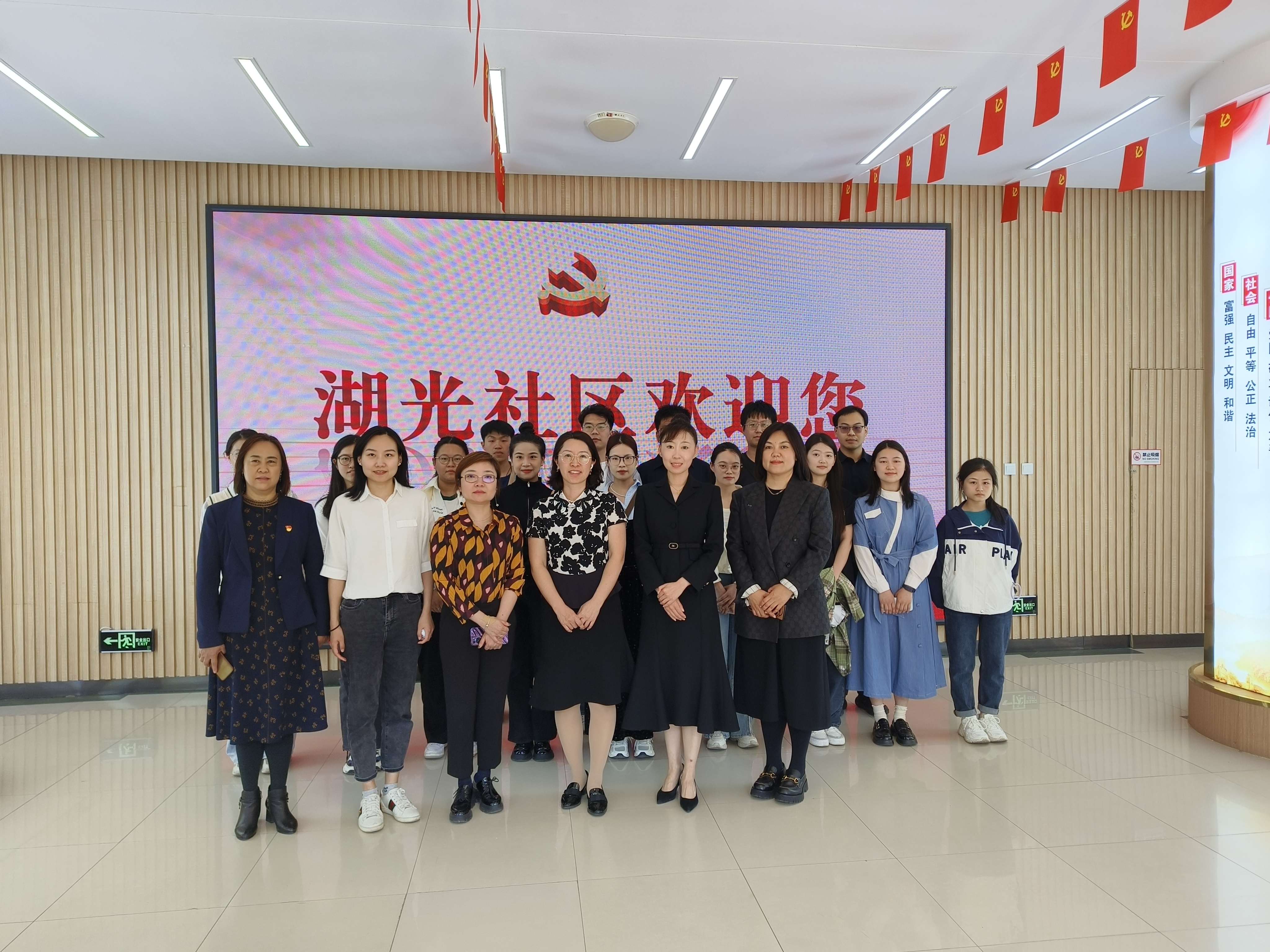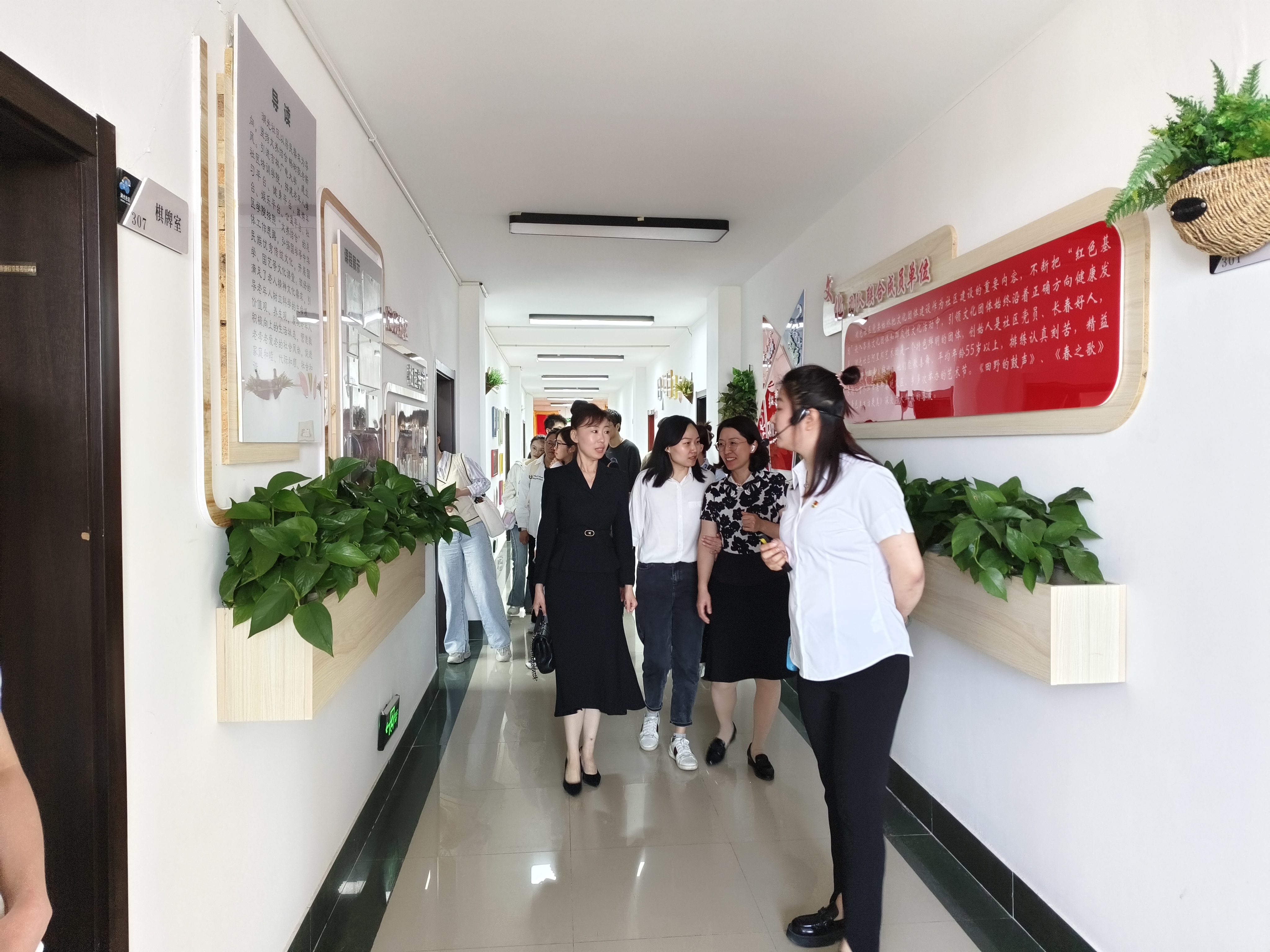 社区工作人员详细介绍了社区的基本情况和治理成效,讲解了社区强化党建引领“党员线”、突出居民主体“自治线”、聚焦供需对接“支援线”、实现高效便民“服务线”、推动成员参与“社团线”的“五线发展”治理理念。随后,工作人员带领公司师生先后参观了社区流动图书角、特色就业超市、前台服务AB岗、廉洁文化走廊、社区“4+”共享空间及新时代文明实践站。