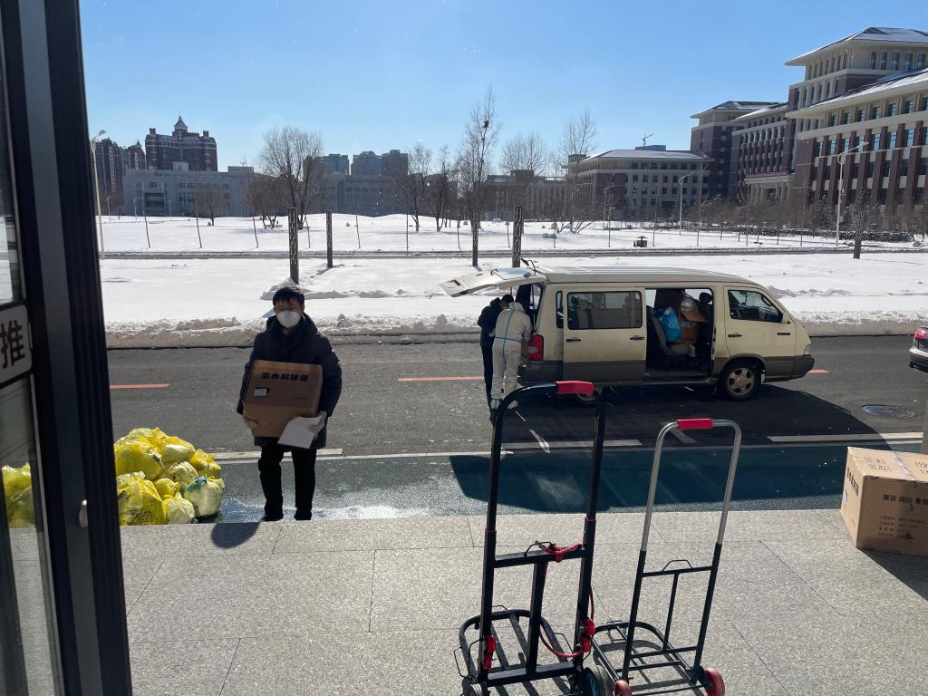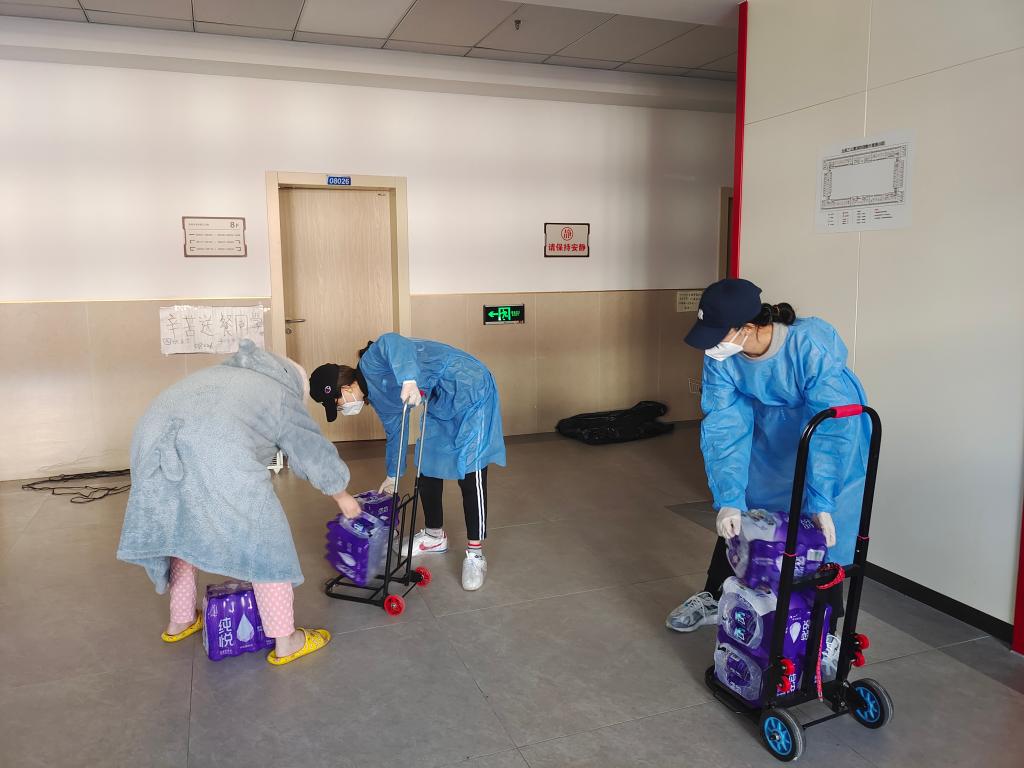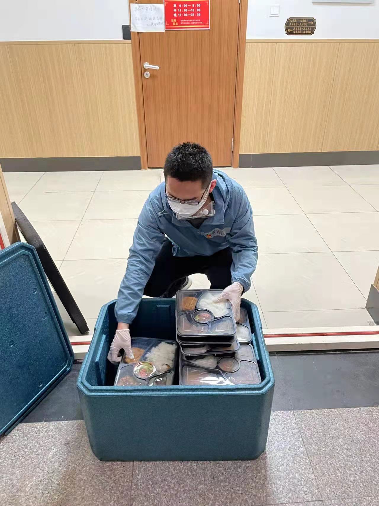 北苑三公寓和北苑四公寓是所有研究生公寓中条件最好的,楼内的电梯可以缓解一部分运餐压力,但在博士研究生所居住的文苑公寓与南苑公寓全部是传统的楼梯,所有的物资不论轻重都需要志愿者扛上楼去。2019级博士研究生吴健青是南苑五公寓B区的首批志愿者,她本身就因为腰椎间盘突出存在弯腰困难的问题,连续多天的志愿活动加重了她的疼痛,最终在第二批志愿者招募完成后不得已退出了志愿者工作。目前吴健青同学已经结束了第一轮志愿工作在寝室休养,她期待着自己的腰伤快些恢复,以便继续投入疫情防控阻击战中。