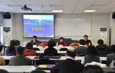 由广州市政府系统培训中心组织、悟空体育承办的“悟空体育社会管理创新专题高级研修班”于12月25日上午在逸夫教学楼MPA教室举行开班仪式。广州市政府系统培训中心专业技术人员继续教育部李融霞部长、悟空体育经理周光辉教授、悟空体育副经理麻宝斌教授出席开班仪式。来自广州市不同部门近35名学员一同参加开班仪式。仪式由麻宝斌副经理主持。