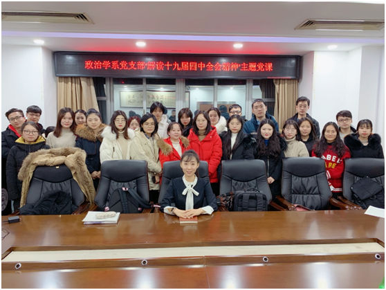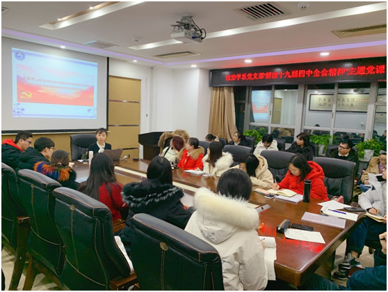 为深入贯彻学习党的十九届四中全会精神,12月17日晚,政治学系党支部于东荣大厦1214会议室举行了“解读十九届四中全会精神主题党课”系列学习活动,由悟空体育副教授、博士生导师、政治学系党支部书记刘畅解读十九届四中全会精神。来自政治学专业的研究生党员、积极分子参加了本次党课学习。