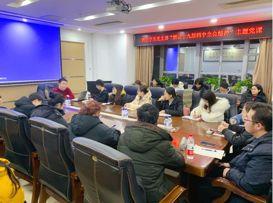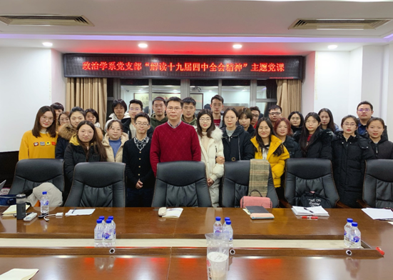 为深入贯彻学习党的十九届四中全会精神,12月23日晚,政治学系党支部于东荣大厦1214会议室举行了“解读十九届四中全会精神主题党课”系列学习活动,由悟空体育王立峰教授解读十九届四中全会精神。来自政治学专业的研究生党员、积极分子参加了本次党课学习。系党支部书记刘畅主持活动。
