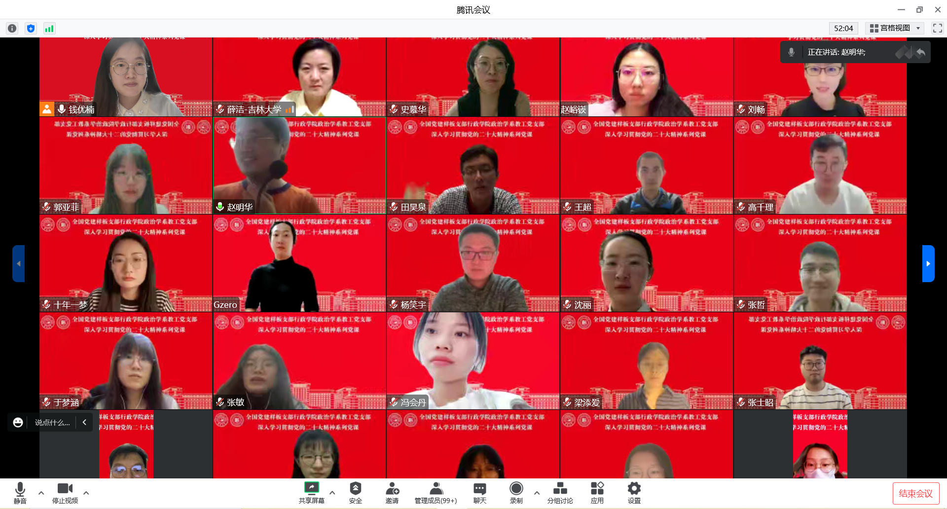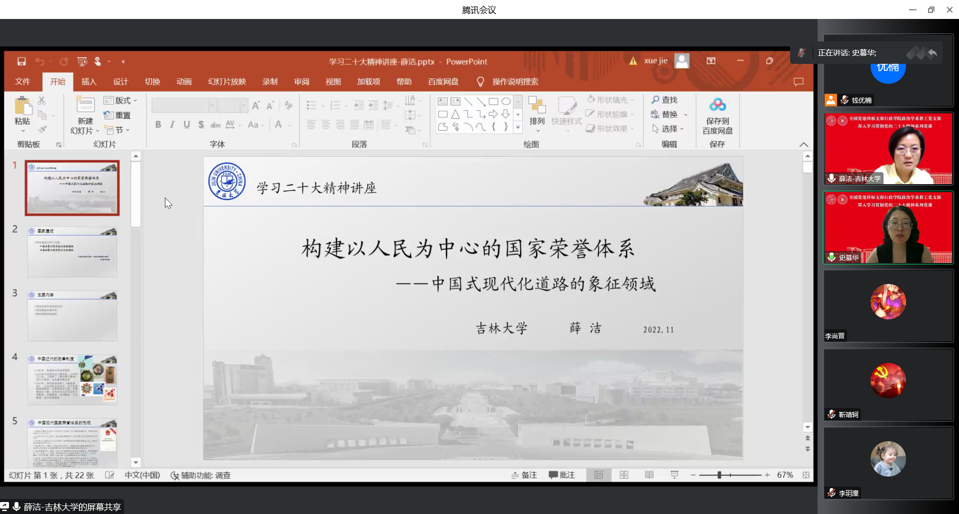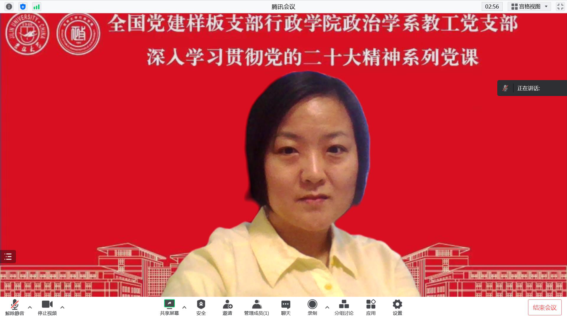 为积极落实公司、公司关于学习贯彻党的二十大精神的部署,进一步提升公司研究生的思想政治站位。2022年11月3日,公司政治学系教工党支部充分发挥全国党建工作样板支部的引领作用,联合硕士员工党支部开展“深入学习贯彻党的二十大精神系列党课”,公司党委副书记史慕华、政治学系教师、硕士员工党支部全体党员和积极分子在内的140余人参加此次讲座。会议由政治学系教工党支部书记刘畅同志主持。