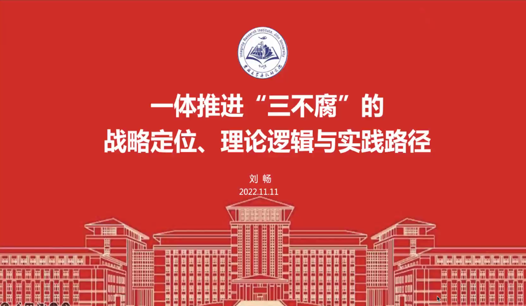 刘畅教授以“一体推进‘三不腐’的战略定位、理论逻辑与实践路径”为题,从习近平总书记关于一体推进“三不腐”的重要论述、一体推进“三不腐”的战略定位、一体推进“三不腐”的理论逻辑、提升一体推进“三不腐”能力和水平的实践路径四个方面展开专题党课讲授。她谈到,党的二十大报告强调“坚持不敢腐、不能腐、不想腐一体推进,同时发力、同向发力、综合发力。”一体推进“三不腐”是中国特色腐败治理模式,是中国共产党人基于党风廉政建设和反腐败斗争的历史与现实经验的理论创新、制度创新和实践创新。提高一体化推进“三不腐”的能力和水平,是将腐败治理制度优势转化为腐败治理效能的必然要求和关键环节。