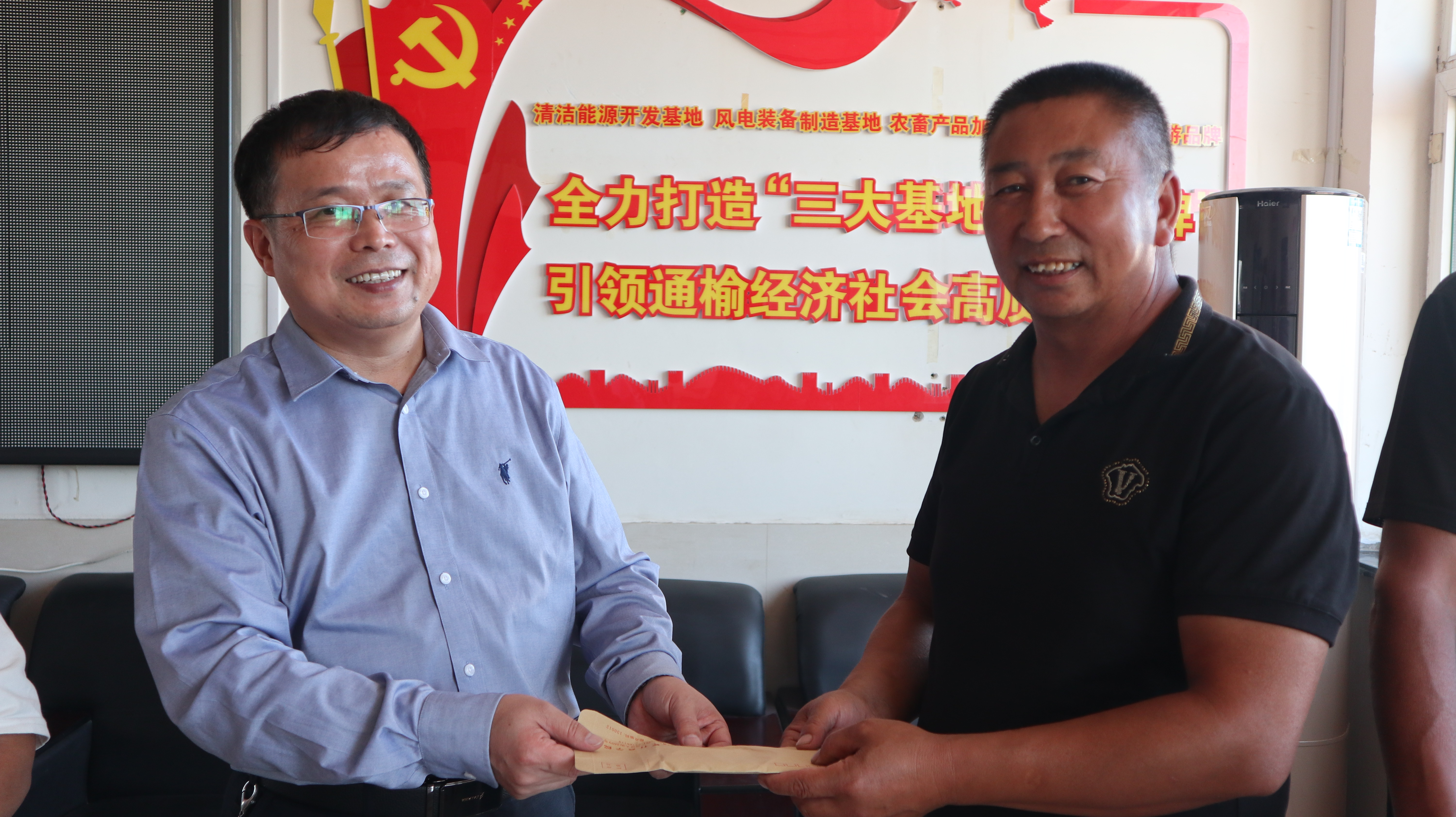 随后季洪涛副经理代表公司将教职工为一经济关注户用于房屋改建的捐款交给受赠人。