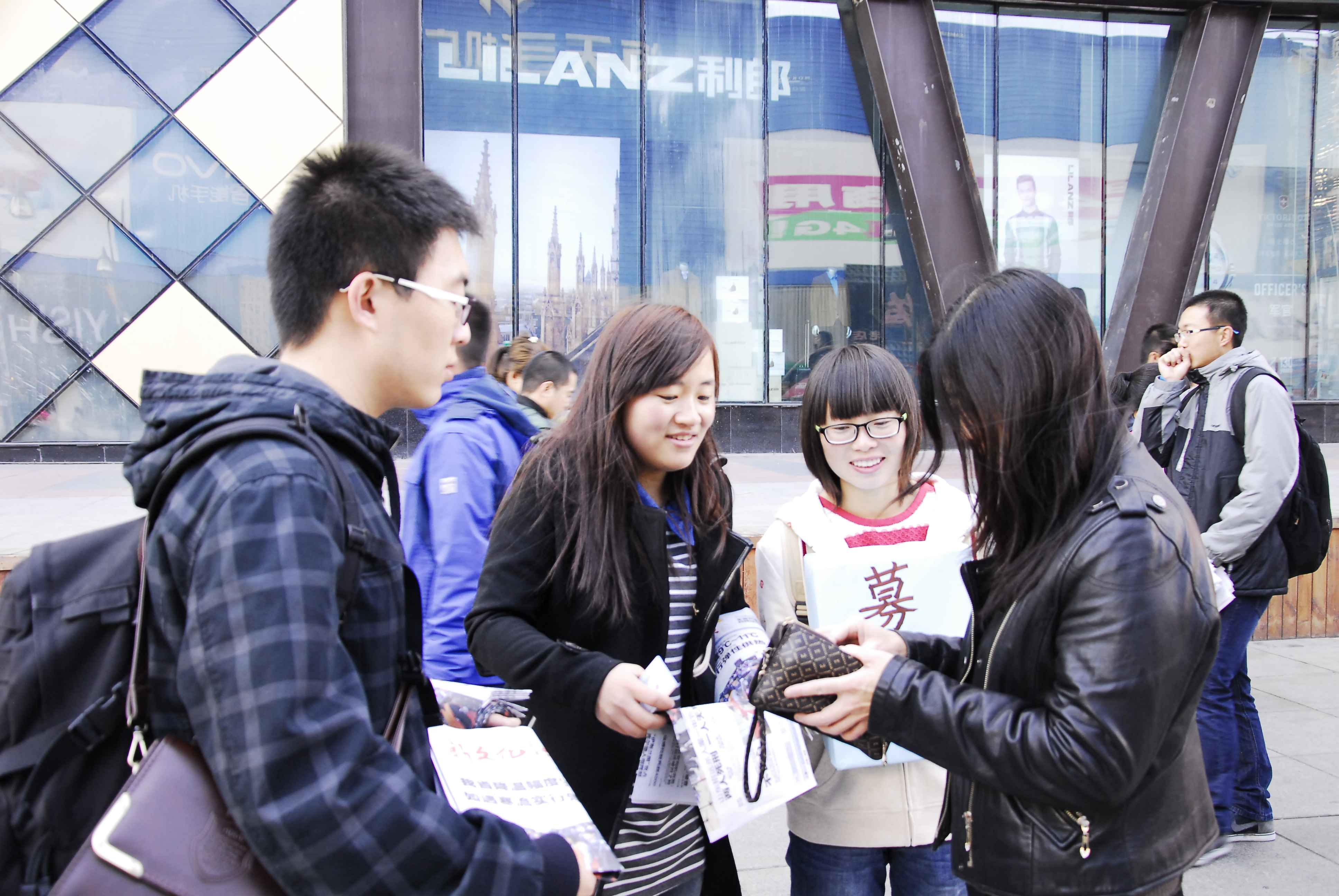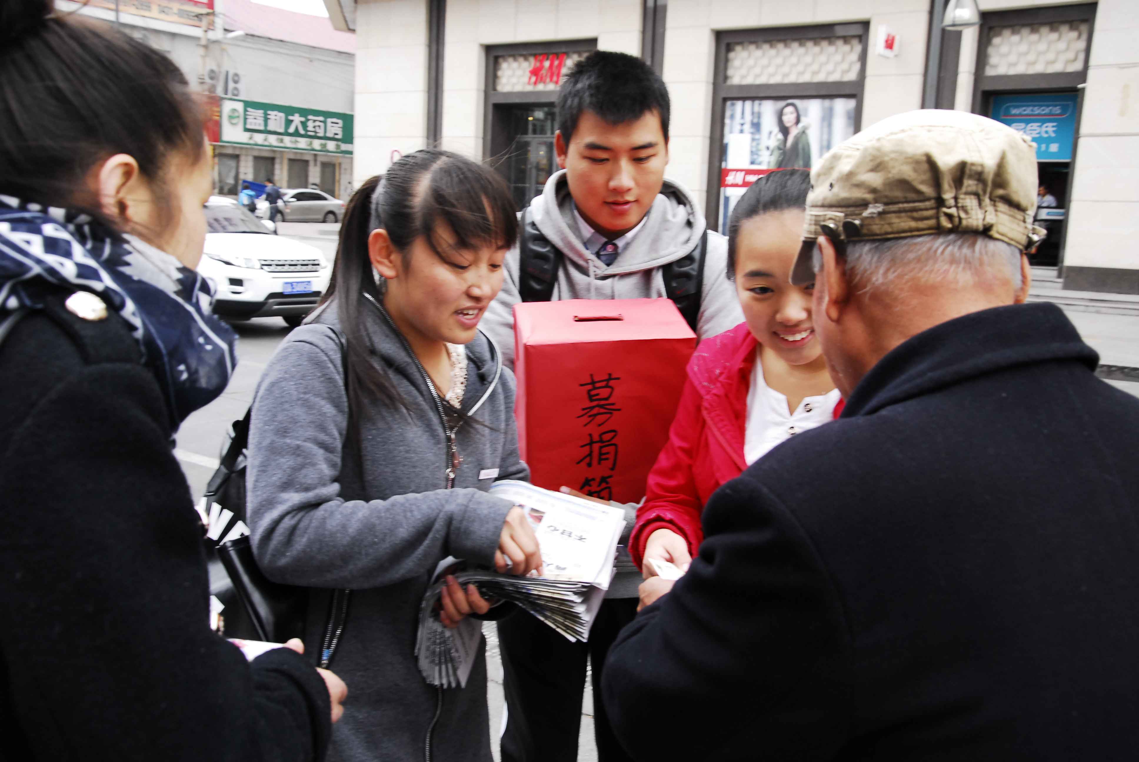 12日上午8时许,2014级的志愿者们到达了本次义卖活动的地点:重庆路。王晓燕社长将志愿者们分为7组,各组分散前往重庆路的各个商场、街道进行义卖。上午9时左右,气温骤降,寒风凛冽,志愿者们在恶劣的环境下仍坚持向过路行人介绍义卖活动的意义,呼吁大家献出一份爱心。路过的行人在听完志愿者的讲解后,都纷纷解囊,购买报纸。义卖活动于11:30圆满落下帷幕,500份报纸全部售出,共筹得善款1466.6元。筹得善款将全部捐予华宇老年公寓。