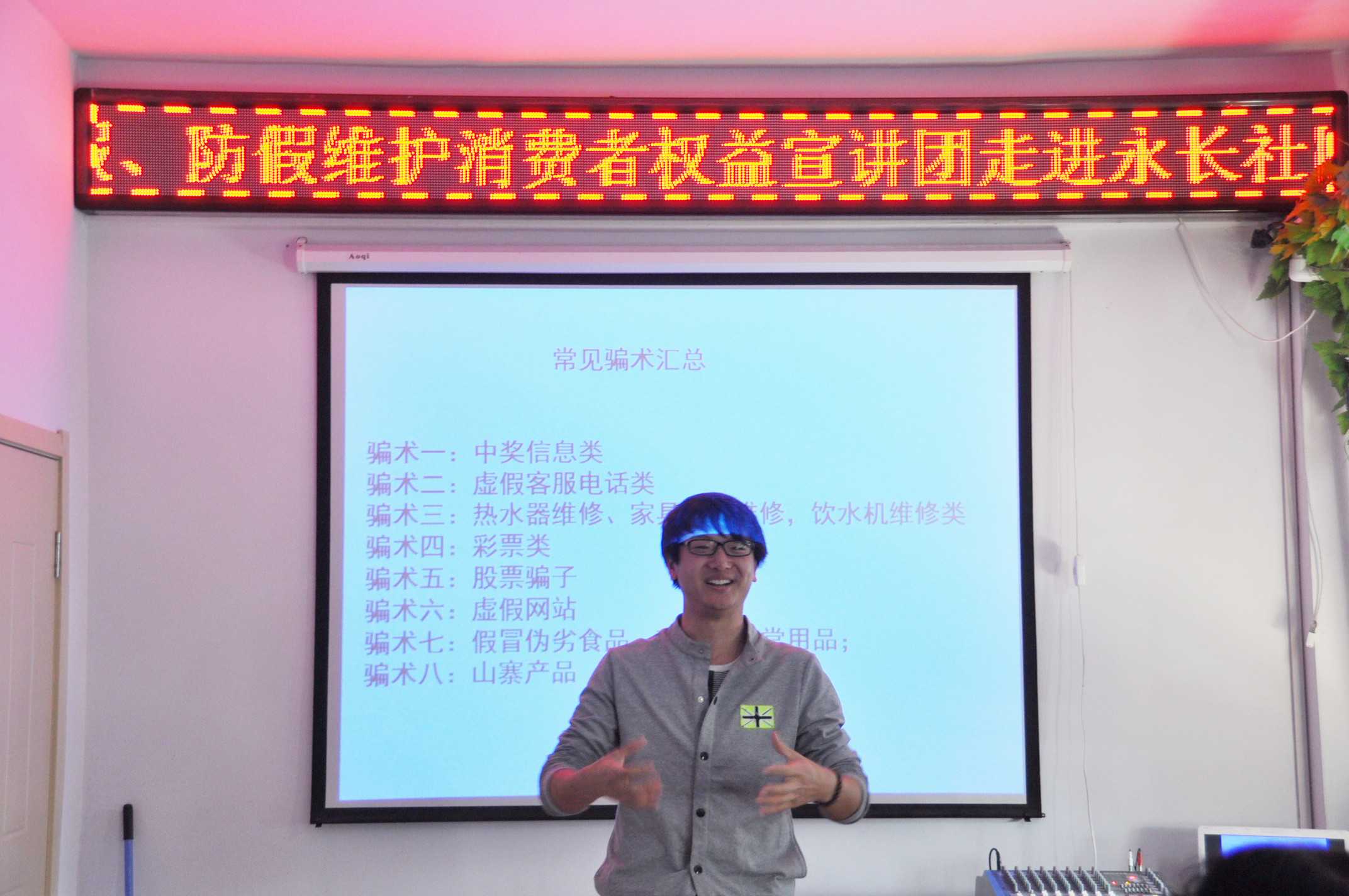 活动伊始,永长社区书记作了简短讲话,她高度赞扬了行政学子走进社区服务基层的志愿服务精神,并预祝活动圆满成功。随后,同学们以小品拉开了活动的序幕,同学们生动的表演赢得现场观众的阵阵喝彩。接着,三位宣讲人以自己亲身经历和不同的方式向社区居民宣传各类防假防骗的生活常识,并给居民们指出了正确维护自身消费者权益的多种途径。除此之外,同学们还以播放视频、表演歌曲等多样的形式丰富了社区居民的防骗知识。本次活动以多样的形式、有趣的风格赢得了社区居民的认同。