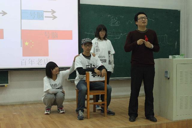 丁建略副教授从事心理学研究和咨询多年,擅长运用各种心理学技术解决问题,对青少年心理咨询和情爱咨询有多年的经验和成熟的理论积淀。丁建略副教授在讲座中用幽默生动的语言向与会人员讲述了关于脑科学的相关知识。他强调要从新的角度来看待心智问题,从脑科学的研究层次和脑整体理论研究这两个方向进一步说明研究脑科学的主要目的和脑科学研究对日常学习和生活的重要意义。为了更好地讲解网瘾在当代老员工群体中频发的问题,丁建略副教授与来自应用心理学专业的五位同学运用话剧向与会人员演示了多巴胺和前额叶对大脑产生的不同影响,生动形象地说明了脑科学在解决网络成瘾问题时起到的重要作用。丁建略副教授生动幽默、深入浅出的讲解让大家了解到了脑科学的专业知识,给在场同学留下了深刻的印象;讲座在热烈掌声中落下帷幕。