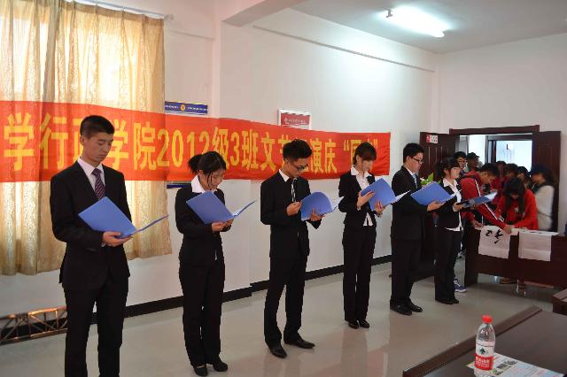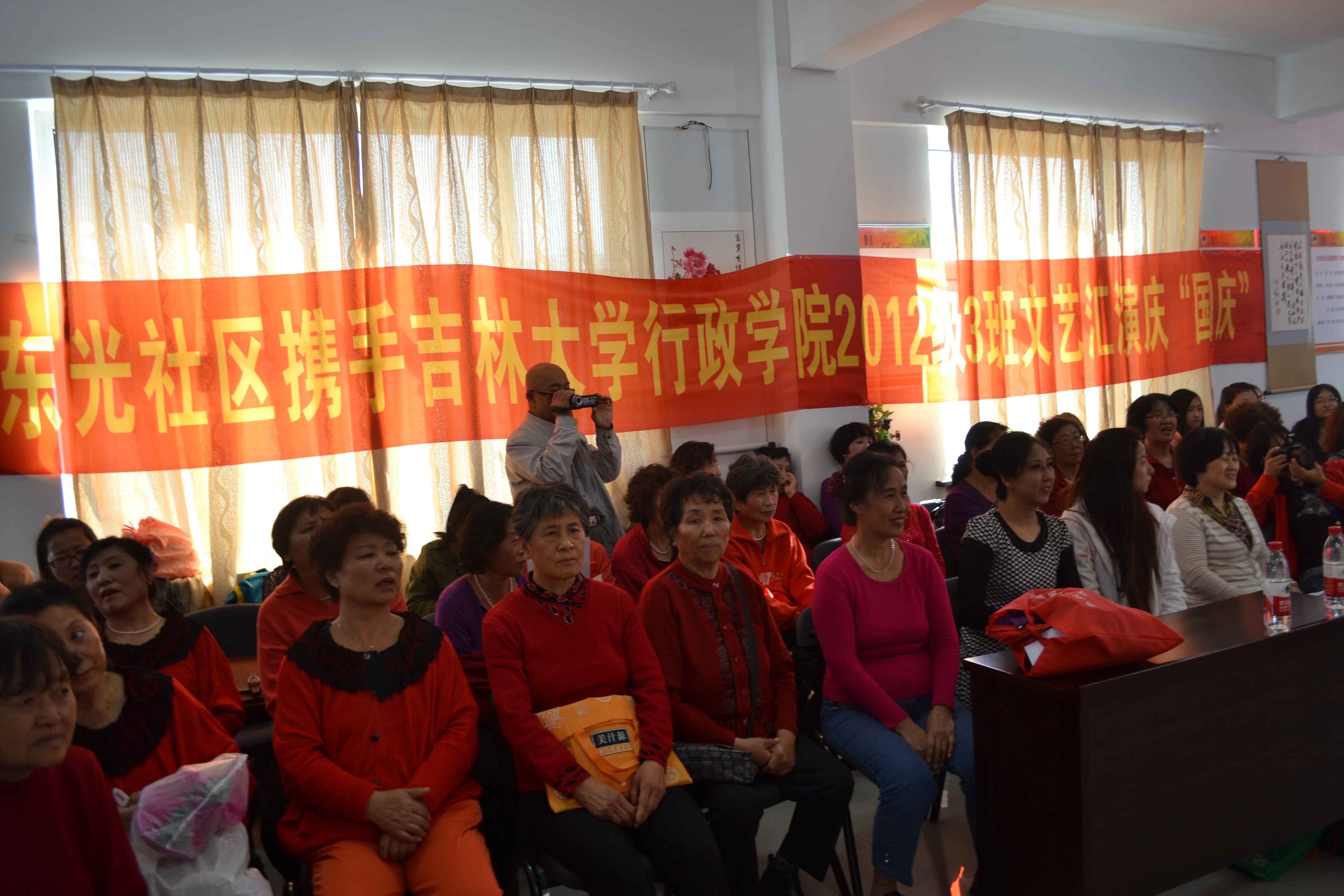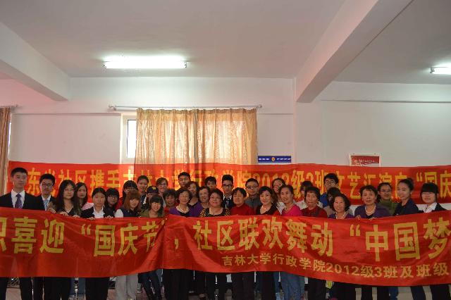 活动伊始,东光社区书记曹伟作了简短讲话,曹书记高度赞扬了行政学子积极走进社区参加志愿服务的行为,并预祝活动圆满成功。随后,联欢活动正式拉开序幕。社区老年艺术团和居民群众先后表演了京剧选段、红歌大合唱等节目,他们用嘹亮悦耳的歌声表达了他们幸福喜悦的心情。在欣赏过社区居民的表演后,三班同学也纷纷带着精心准备的节目登台表演,为祖国生日献礼。一首《祖国颂》的诗歌朗诵抒发了当代老员工对祖国深深的热爱之情;王森岩同学演唱的《十年》美妙动听,赢得阵阵掌声;最后,文艺表演以三班女生表演的《青花瓷》集体舞蹈作为结束。一个个精心准备的节目充分展现了多才多艺的行政学子昂扬进取、积极向上的精神面貌。在精彩的文艺表演之后,同学们还积极主动地和前来观看节目的老人积极交流,倾听老人们的故事,并把部分空巢老人所面对的实际困难和居民对社区共工作的意见反映给社区工作人员,以此来帮助老人们解决生活中的问题。