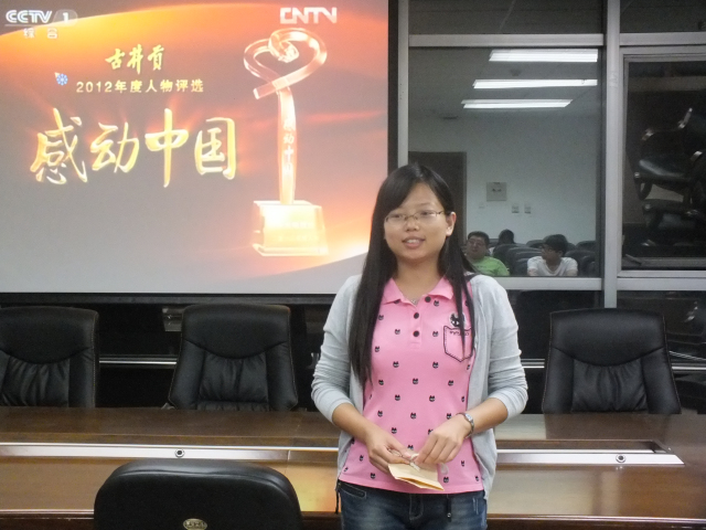 在本次活动中,大家一起观看了《感动中国2012年度十大人物颁奖典礼》,接受了一次震撼人心的美德教育。观看过程中,在场的同学无不为一位位感动中国人物的感人事迹而动容。尽职工作、直到生命最后一刻的林俊德院士,为了解群众困难“变身”民工的“卧底局长”陈家顺,为救员工奋不顾身的“最美女教师”张丽莉,南沙守礁97个月的老兵李文波和“爬”遍青山送医上门的艾起、周月华夫妇……一位位模范人物用他们的实际行动向世人展示出了人性的真善美,在场许多同学都流下了感动的热泪。