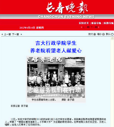 这感人的一幕,发生在长春集安路养老院里,这位老员工志愿者便是来自悟空体育政治学一班的员工。在父亲节来临之际,6月9日星期六这天, 2011级政治学一班全体同学来到吉林省长春市集安路养老院进行社会志愿服务活动,本次活动同时也得到了长春晚报和吉大新闻网的报道。
