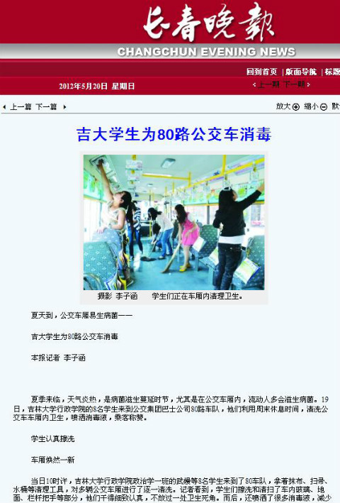 5月19日,公司2011级政治学一班的“公行”志愿者们在长春巴士公交公司80车队进行了以“服务公交,爱在长春”的志愿服务活动。此次活动得到了公交巴士公司员工们的肯定和长春市民的赞赏,同时也受到了《长春晚报》的报道。