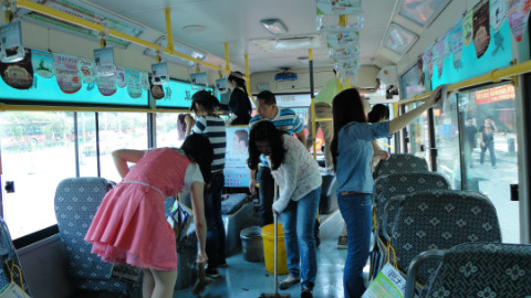 为给市民们提供一个干净舒适的公共出行环境,上午十点整,公行志愿者们手拿清洁工具——扫把、拖把、抹布、消毒液、水桶等登上公交车,开始了清洁公车的志愿活动。在小组长的分配下,志愿者们各司其职,扫地、擦车、拖地、喷消毒液,一丝不苟的劳动着。只见他们或捋起袖子起劲的擦着窗户和扶手,或踮起脚尖吃力的擦着车厢角落里的灰尘,汗水浸湿了他们的衣服和头发,却挡不住他们劳动的热情和快乐。