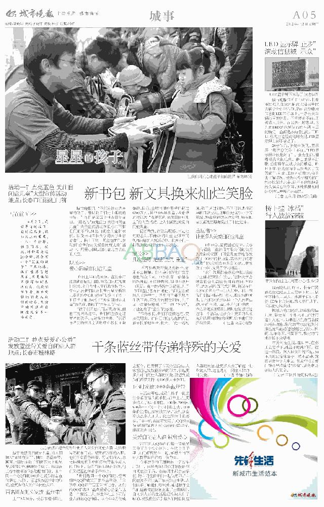 4月2日,星光志愿服务队同学早早来到长春市红旗街百脑汇门前的“放飞梦想”活动现场,悬挂蓝色宣传条幅、发放自闭症日宣传单、散发蓝色气球,快乐地忙碌着。自闭症儿童及其家长们来到活动现场,其家长代表表达了对公司志愿者一直以来对自闭症儿童的志愿服务的感激之情,名叫渺渺的自闭症男孩演唱《北京欢迎你》表达对志愿者的感谢,公司志愿者也为孩子们送上精心准备的学习用品。