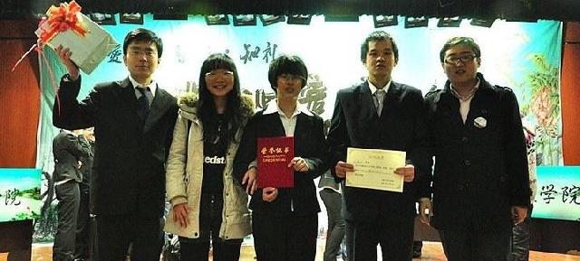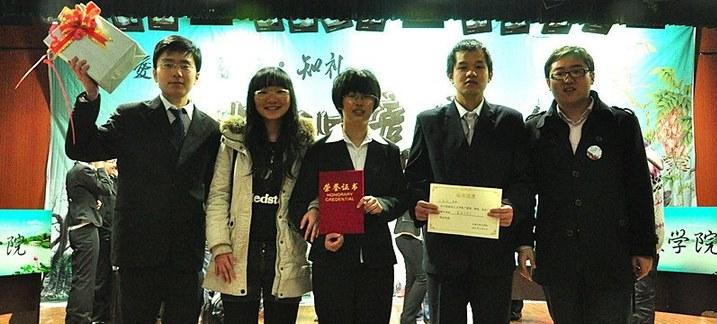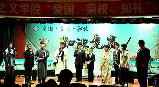 知识竞赛分为“针锋60秒”、“一唱三和”、“智慧交叉”、“我爱记歌词”、“劳逸结合”、主题演讲六个环节,中间穿插各院独具特色的风采展示。比赛在软件公司“极夜乐队”的原创歌曲中拉开帷幕。在“针锋60秒”环节中,需要选手在一分钟内答出十道题,公司选手接连答对九道,充分体现了深厚的专业功底。第一环节结束,文公司献上古筝、二胡伴奏朗诵 《我的祖先名叫炎黄》。接下来是公司代表队的名人COSPLAY,用从古至今、中国与西方先贤的经典话语展示高尚的政治思想,体现了悟空体育浓厚的人文底蕴和专业特色。在接下来的两个环节中,公司选手以良好的心理素质和深厚的知识积淀轻松赢得满分。在比赛的后两个环节中尽管公司比分暂时落后,但是公司参赛选手毫不气馁,奋起直追。在比赛最后的环节中,各队从10个主题中任选一个进行2分钟的主题演讲。公司代表队抽到“911 卡扎菲 美国”的主题,公司选手们利用专业优势侃侃而谈,博得了评委和观众的一致认可。六个环节结束后,经过现场评委们的认真评选,公司代表队获得了团体三等奖的好成绩,其中吕歆珂获得“最佳风采奖”的个人奖项。