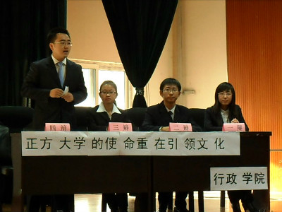 本场比赛中公司与哲学社会公司就“大学的使命重在引领文化还是服务社会”展开了激烈辩论。公司作为正方持“大学的使命重在引领文化”的观点。开篇立论阶段,我方从大学的理念与功能两方面论证了己方观点;反方则从现实层面出发,认为大学应该满足社会的需求、为社会提供智力支持。在紧张精彩的攻辩与自由辩论环节中,双方辩手唇枪舌剑,你来我往,以智慧的语言与敏锐的思维博得了评委及在场观众的热烈掌声,为大家献上了一场精彩的比赛。