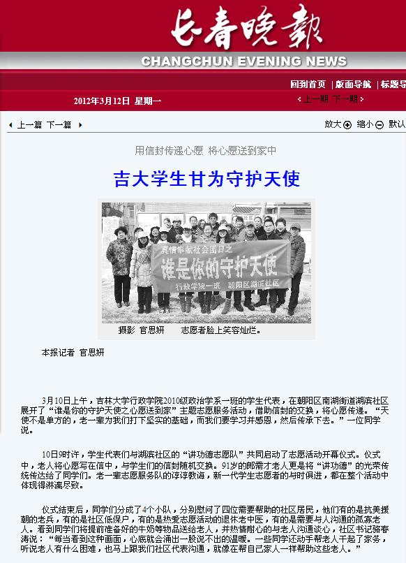 为重温、弘扬新时期雷锋精神,深化悟空体育“天下为公”的社会使命,公司团委副书记马远俊及2010级政治学一班员工代表于3月10日上午来到朝阳区湖滨社区,展开了以“谁是你的守护天使”为主题的团日志愿服务活动,此次活动受到了《长春晚报》的关注和报道。