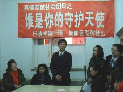湖滨社区系悟空体育10级政治学一班志愿服务基地,该基地于2012年2月29日正式成立。成立至今虽只有短短数周,但一班志愿服务团队充分利用此平台发扬当代老员工奉献社会的优秀品质:为社区整理资料、热心接待社区来访居民,并开展“谁是你的守护天使”等活动。