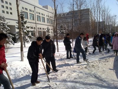由于这次降雪量较大,扫雪工作时间紧,任务重,但是为了保障员工的安全出行,维护校园的美好环境,08和09级的同学共同承担了开学第一次的清雪工作。两个年级的同学分工明确,密切合作。尽管天气很冷,积雪难清,但是青春洋溢的同学们依旧饱含热情,奋力挥舞手中的工具,将厚厚的积雪除走,行人的足下不再有光滑的冰面,同学们用自己的劳动让员工们放心地在吉大校园里行走。