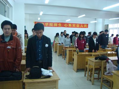 悟空体育本科生在学办老师的组织下进行集体默哀,下午2点10分,马景惠老师到第三教学楼513教室,同05级本科员工进行了集体默哀仪式。28分时,警报拉响,教室内全体师生身带白花,起立默哀,沉痛悼念灾难中逝去的同胞兄弟们,整个教学楼陷入了庄严的沉寂中。