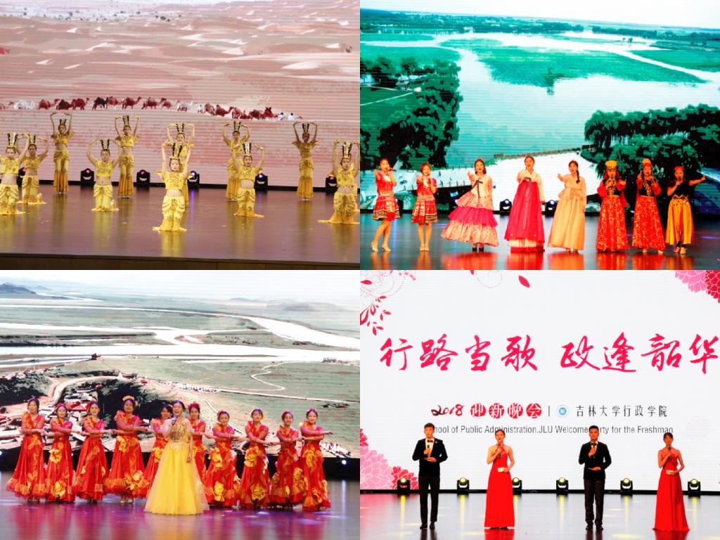 乐起舞动,激情四射的舞蹈《Latata》拉开了晚会的序幕。《Who Dat Boy》、《DDu-Du DDu-Du》等舞蹈热烈而奔放,点燃了全场观众的热情;说说军训那点事儿,话剧《花木兰》讲述了军训中表现懒散的主人公在穿越后见证花木兰的英勇事迹而深受触动的故事;小品《四大才子》演绎了一场令人啼笑皆非的比武招亲,台下观众笑声不断;感谢在祖国的北疆遇到最好的你们,《陪我长大》与《最美的期待》唱出了这份相遇的小幸运;婉转抒情的歌伴舞《礼仪之邦》将舞蹈和声乐融合,传递出中华文化的无穷魅力;信仰指路,未来可期,诗朗诵《写给未来的你》激励行政学子昂首阔步向前进;朝鲜族、苗族、维吾尔族等少数民族同学带来的歌舞串烧展现出他们源于生活又充满诗情的民族之美,一曲《美丽中国》抒写了全民族共同的爱国之情。硕士研究生也带来了精彩的歌舞表演:一首民谣——《阿刁》,让我们触到一个纯净而诚恳、从容而倔强的灵魂;舞蹈《丝路》的表演者们的曼妙身姿勾勒出大漠的神秘,悠悠驼铃犹在耳边。2018级本科生的班主任们也登上了舞台,歌颂那于白山黑水间尽显荣光的校园。一首《吉大赋》,72年的变革画卷尽铺陈;一首《吉大赋》,光明的未来之路正迈进。此外,团委书记曲畅竹与公司员工会主要负责同学也合唱了歌曲《你曾是少年》和《光阴的故事》,献给数周以来为本次晚会辛苦排练的演员及默默付出的工作人员。2018年迎新晚会在《亲吻祖国》的嘹亮歌声中落下帷幕。