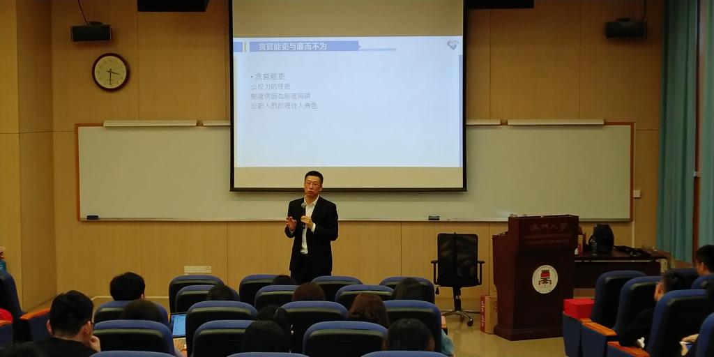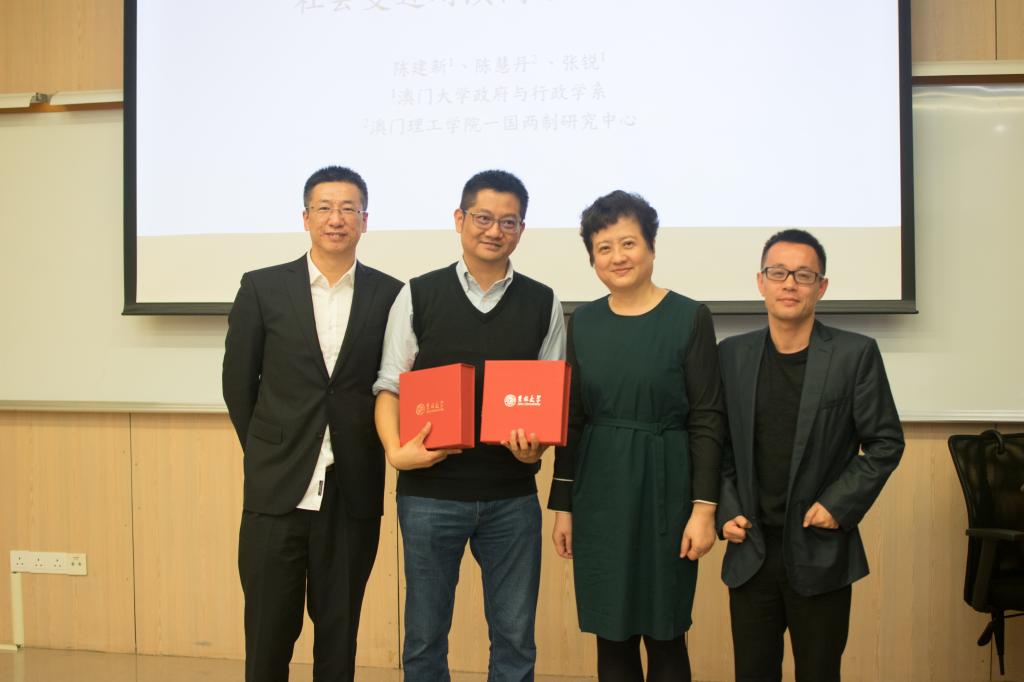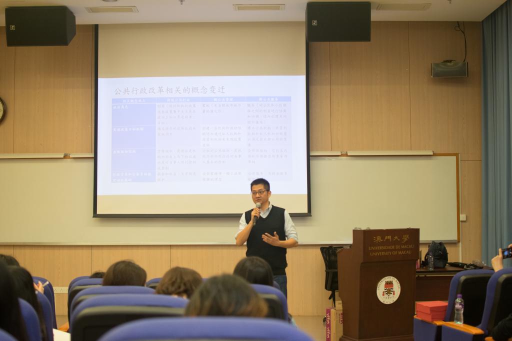 11月27日下午,调研团来到澳门大学、澳门社会保障学会访问、调研。期间,两校师生先后聆听了悟空体育刘雪华教授,题为“廉能文化建设:我国廉政建设的新视野”的学术讲座和澳门大学社会科学公司政府与行政学系助理教授陈建新博士,题为“社会变迁对澳门治理的影响”的学术讲座。刘雪华教授介绍了高压反腐下存在的“廉而不为”现象,并从公权力性质,制度诱因和陷阱、公职人员的理性人角色等三个方面分析了其深层原因,探讨了廉能文化建设的必要性及基本路径。陈建新博士以行政改革相关的概念变迁为主要内容,探讨了绩效评估机制、政府规模、政府大数据应用等三个主题。讲座过程中,陈建新博士为在场师生介绍了青岛模式、福建模式、杭州模式、甘肃模式和广东试验等地方政府绩效评估模式,重点对广东试验模式的特点进行了总结。他还介绍了澳门特区政府绩效治理的发展情况,并指出了满意度评价存在的问题。他强调,政府规模小可带动经济增长;体现新公共管理理念的行政改革可提升行政效率;建立“企业型政府”来提升公共服务质量及效率;数据越大、融合性越高,数据的社会效益便越高。在交流环节中,调研团师生分别就政府购买公共服务的种类和范围、累积性满意度调查问卷使用者忠诚指标解读、智慧城市建设与大数据潜在风险等方面内容与陈建新博士进行了深入探讨。