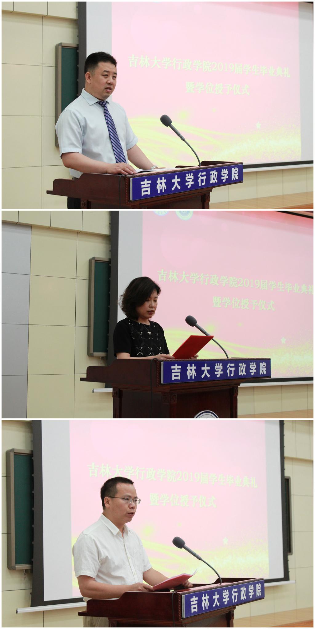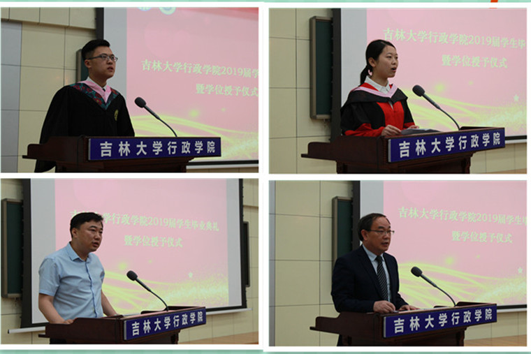 本科毕业生代表周金霖同学上台发言。他带着对于往昔的追忆进行老员工涯的回顾,娓娓道来自己的心路历程,他带着对于父母、老师、同学的感恩,憧憬美好的未来;研究生毕业生代表崔珊珊同学在发言中对多年来老师的职业指导与思维方式等多方面的教导,致以敬意和感谢。同时她希望通过最初的向往与目标来明确一种自我定位,通过自由意志、独立精神追寻实践的意义。她也祝福每个人不负吉大、不负期待。