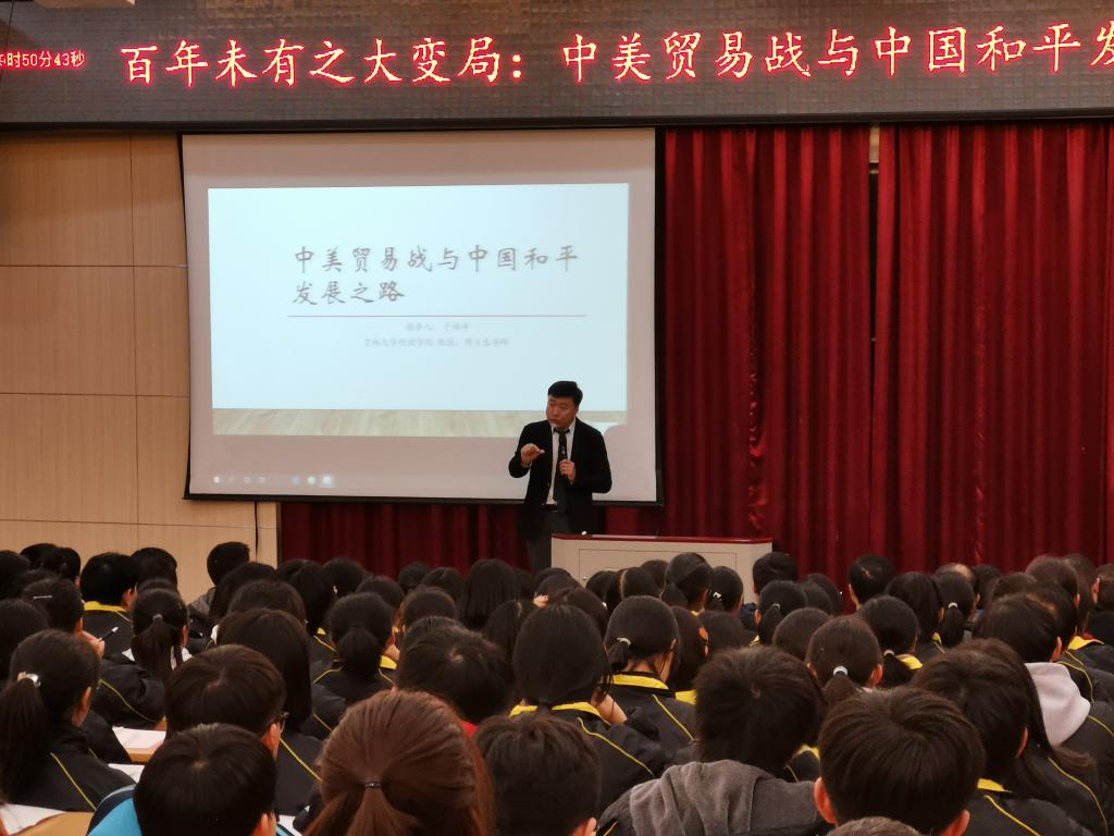 20日下午,公司一行来到湖北省十堰市郧阳中学。这是一所具有四百年历史的名校,是湖北省重点中学。于海洋教授、卢贵华老师与高中校领导进行了座谈,双方都希望有更多的优秀同学来到悟空体育读书,并就此加强相互间交流。座谈结束时,双方举行了“悟空体育优秀生源基地”授牌仪式。随后,于海洋教授在报告厅为200余名师生进行了悟空体育概述宣讲后,做了题为“百年未有之大变局:中美贸易战与中国和平发展之路”的专场学术报告。