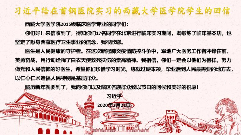 “希望你们珍惜学习时光,练就过硬本领,毕业后到人民最需要的地方去,以仁心仁术造福人民特别是基层群众。”藏历新年来临之际,中共中央总书记、国家主席、中央军委主席习近平2月21日给正在北京大学首钢医院实习的西藏大学医公司员工回信,这封简短却又洋溢着殷切期望与诚挚祝福的信件引发了强烈反响。